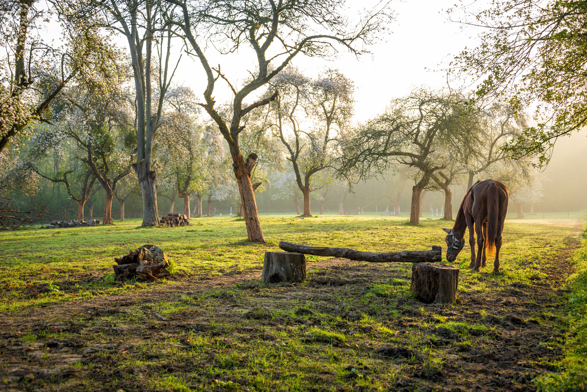On a sunny but frozen morning the horse it eating its breakfast in the orchard