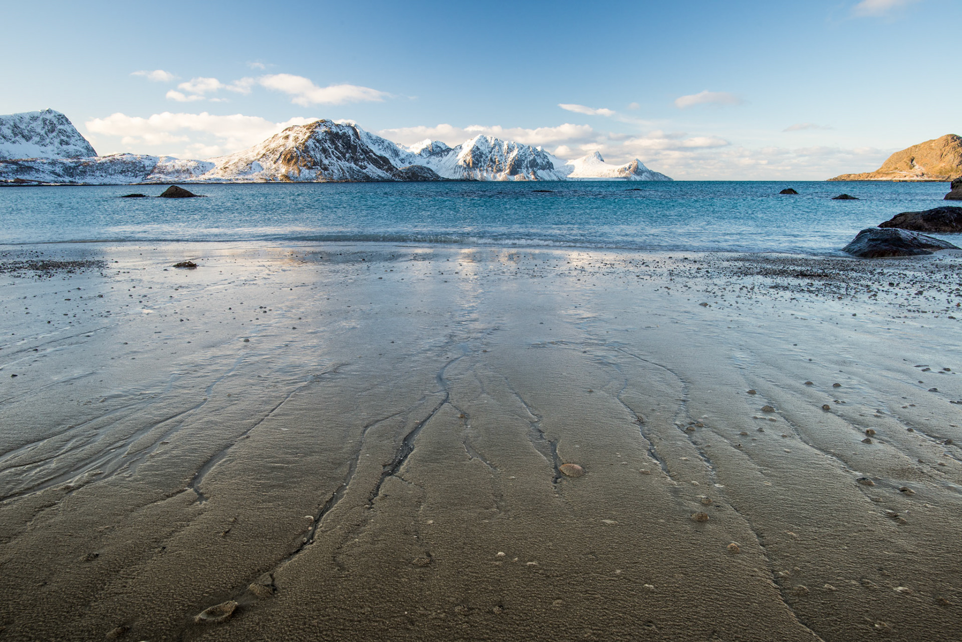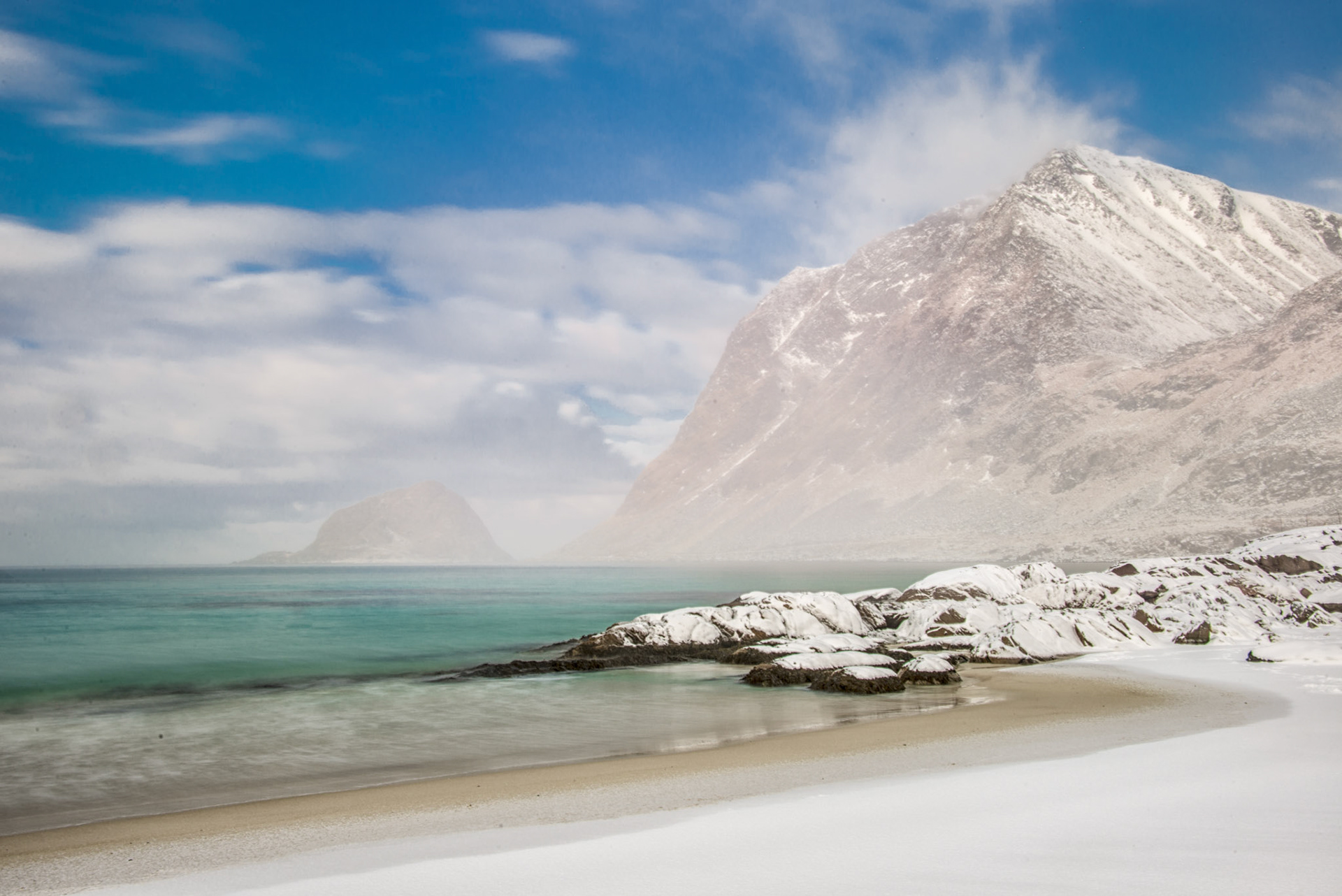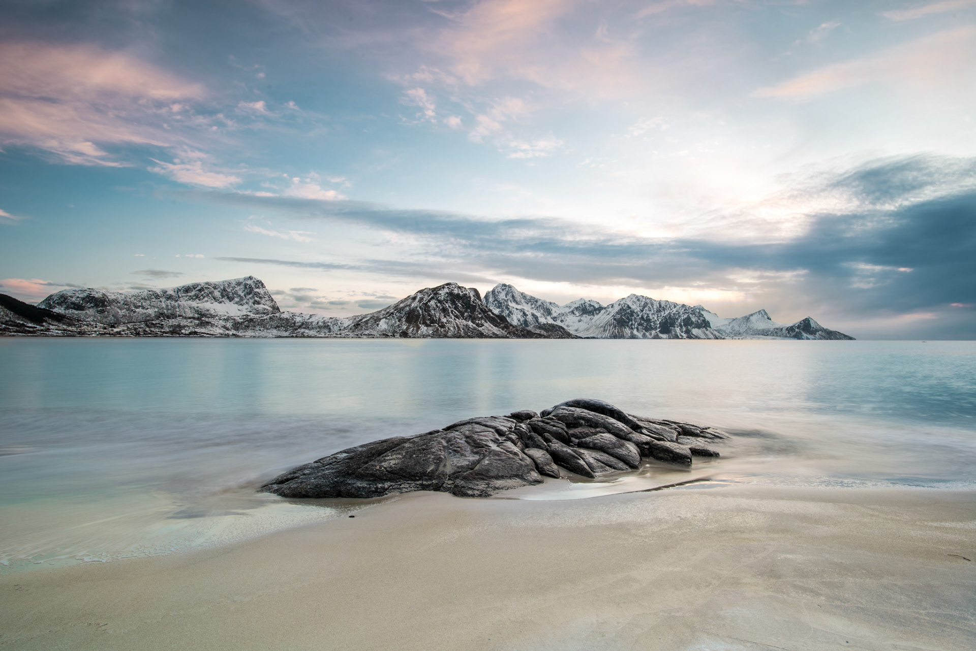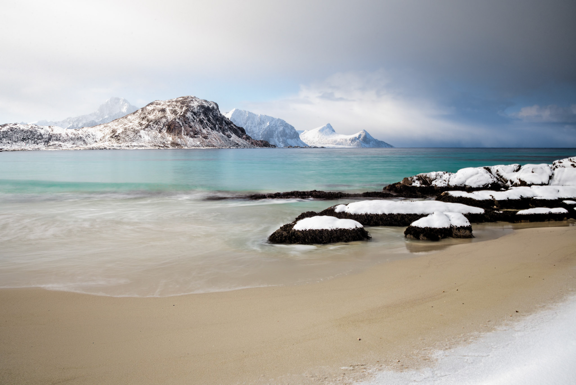 Frozen rocks on Skagsanden beach in Lofoten Norway
