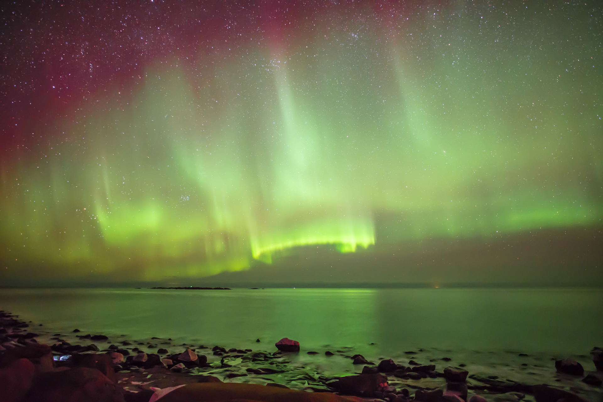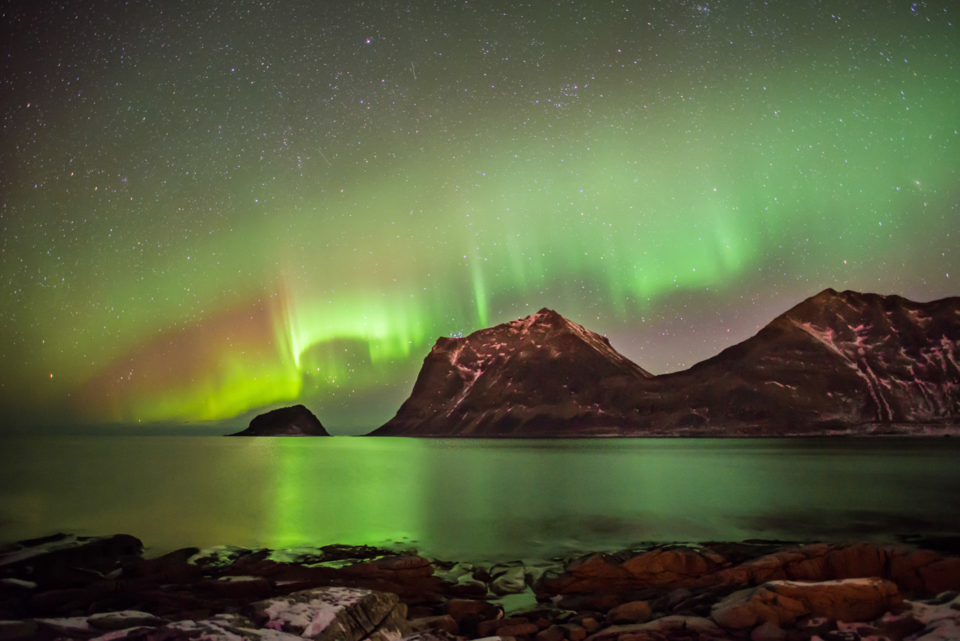 Aurora Borealis reflected in the sea on Myrland beach, Lofoten, Norway