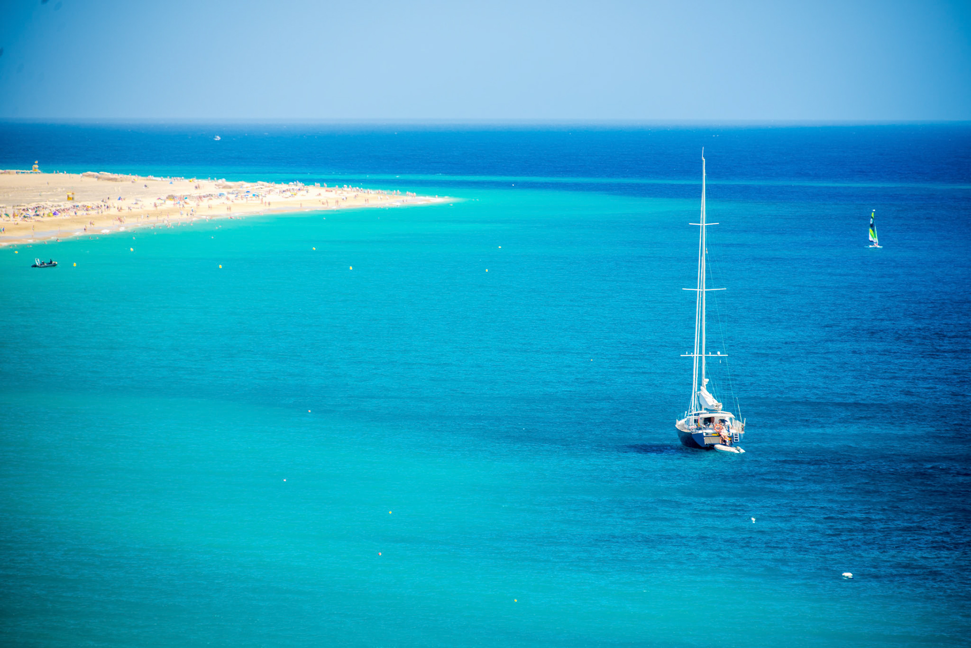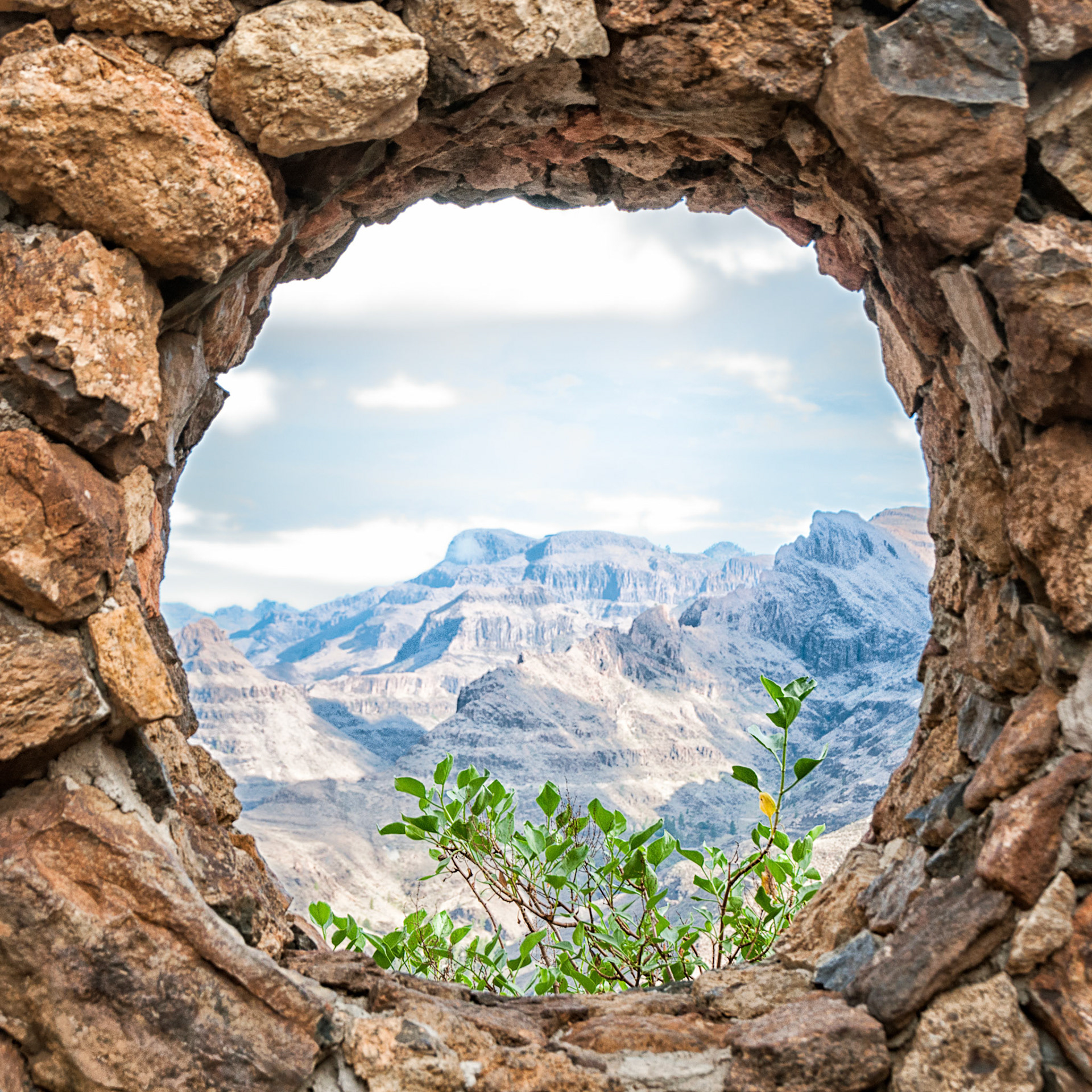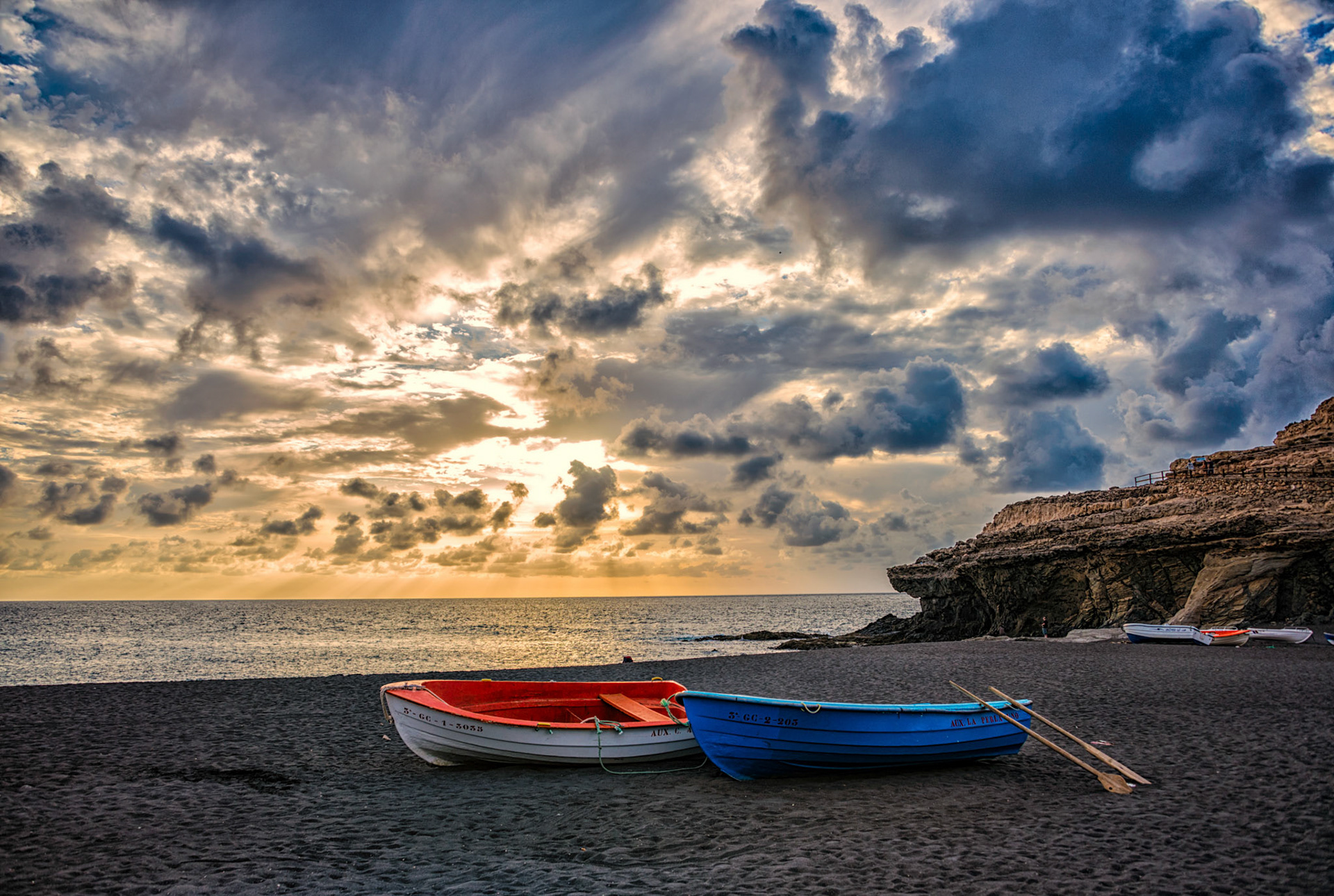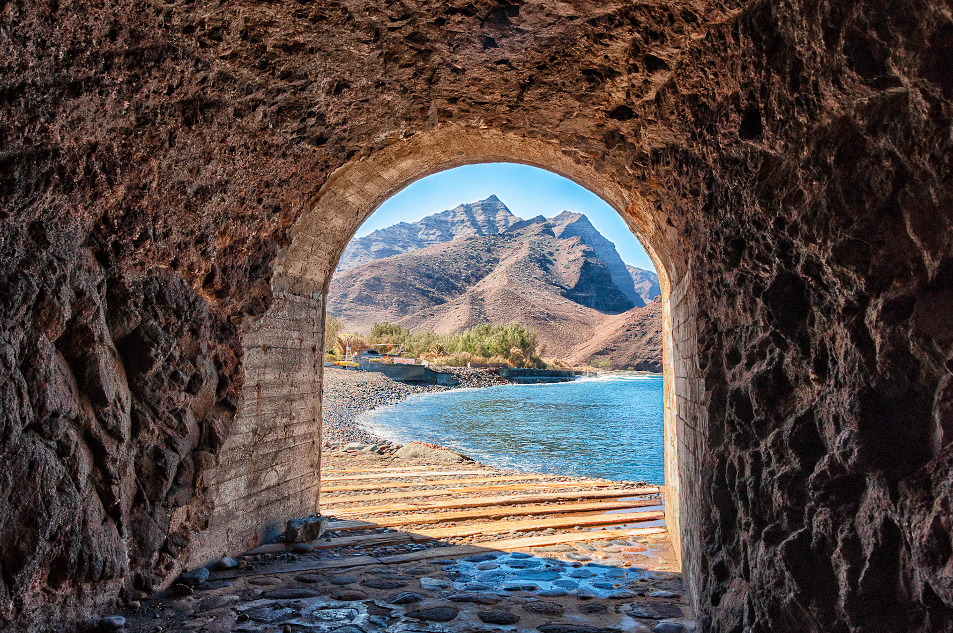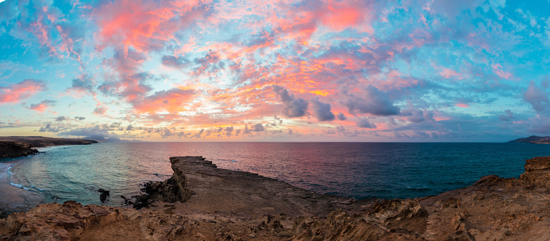 Straw umbrella with sunbeds with a nice view to the mountains and ocean